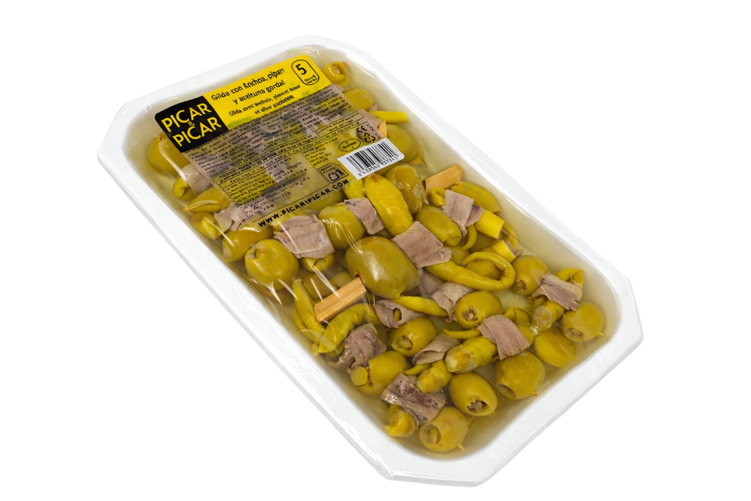 PICAR&PICAR una sabrosa Gilda con anchoa enrollada a la piparra, aceitunas con anchoa y una gordal. En formato de 30 unidades.