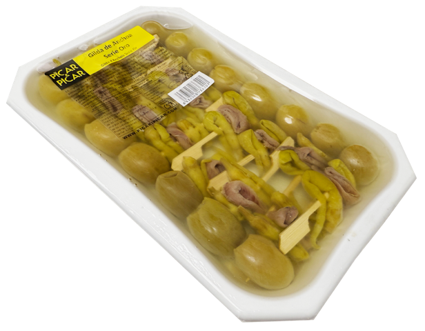 PICAR&PICAR una deliciosa Gilda de anchoa del cantábrico, piparra y aceituna gordal. En formatos de 5, 15 y 50 unidades.